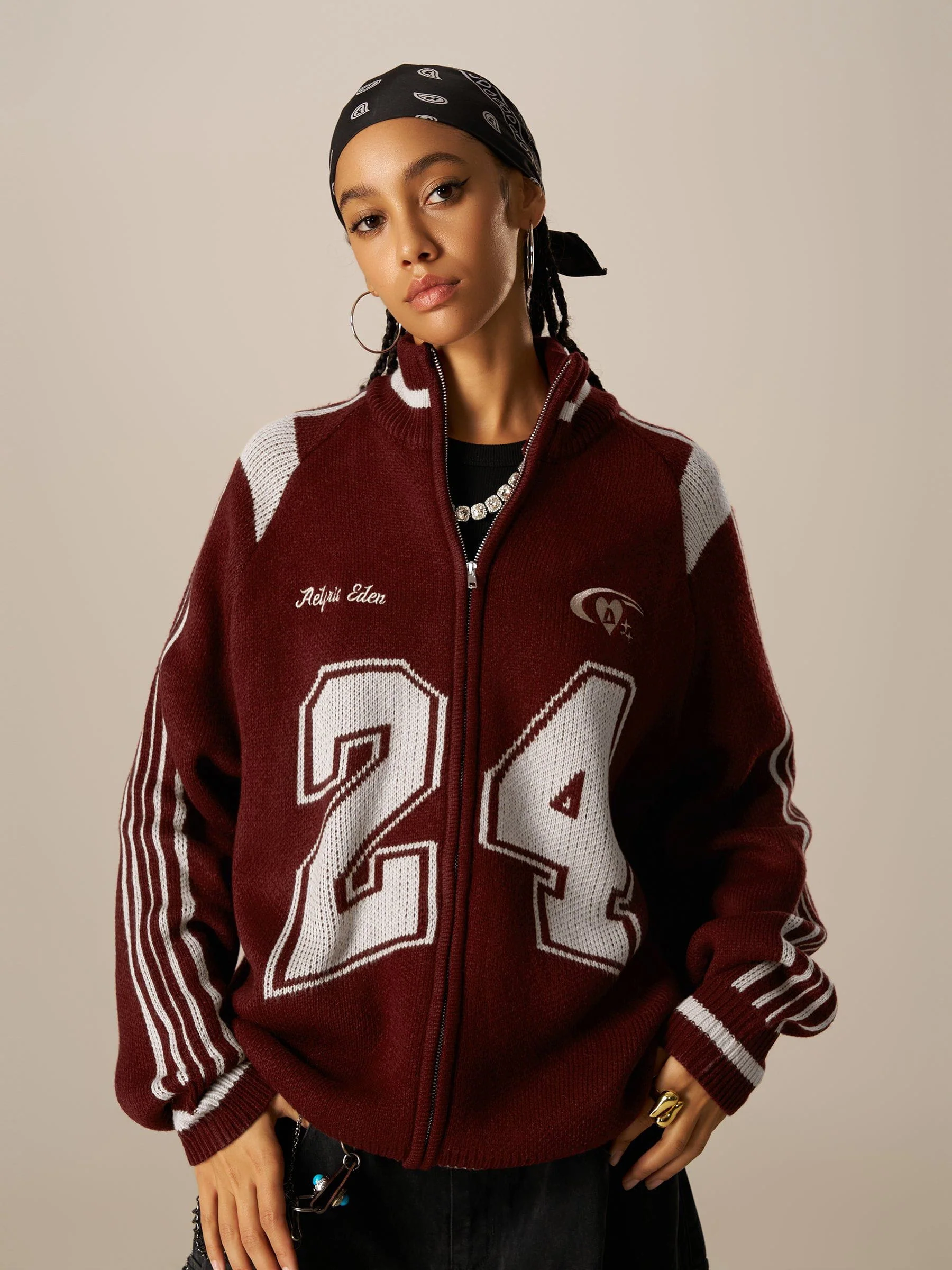 The Aelfric Eden 24 Jacquard Zip Up Cardigan features a unique burgundy color paired with vintage number jacquard patterns, highlighting a natural, laid-back, and sporty casual vibe.